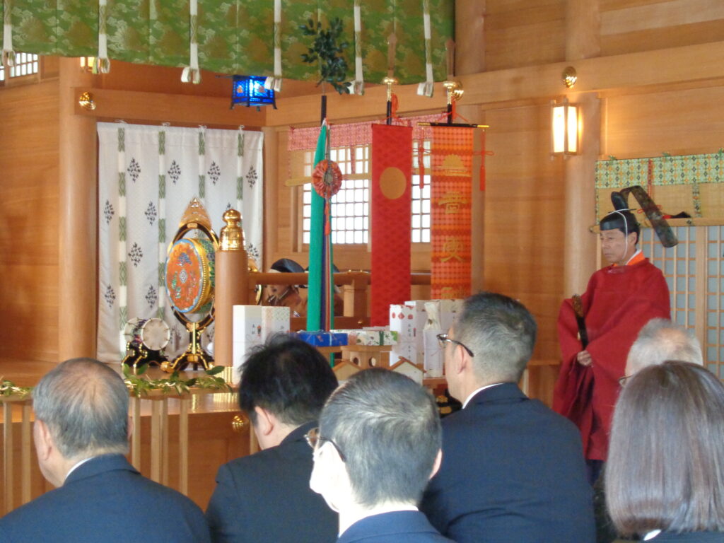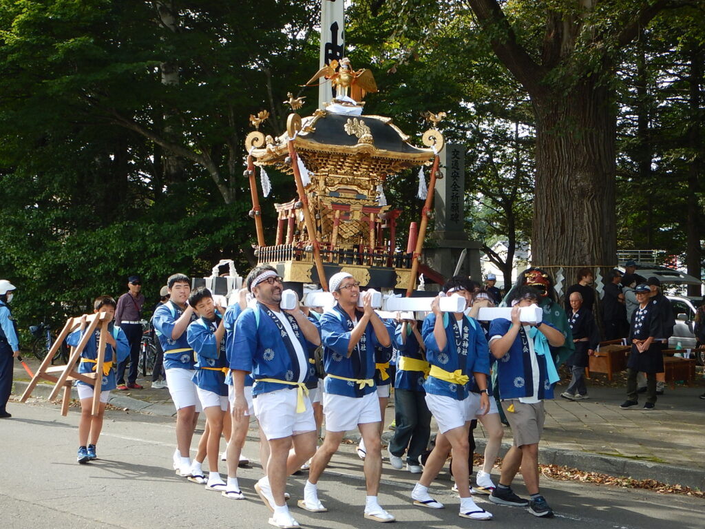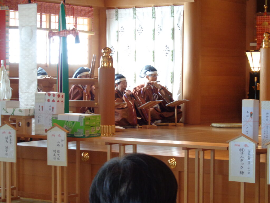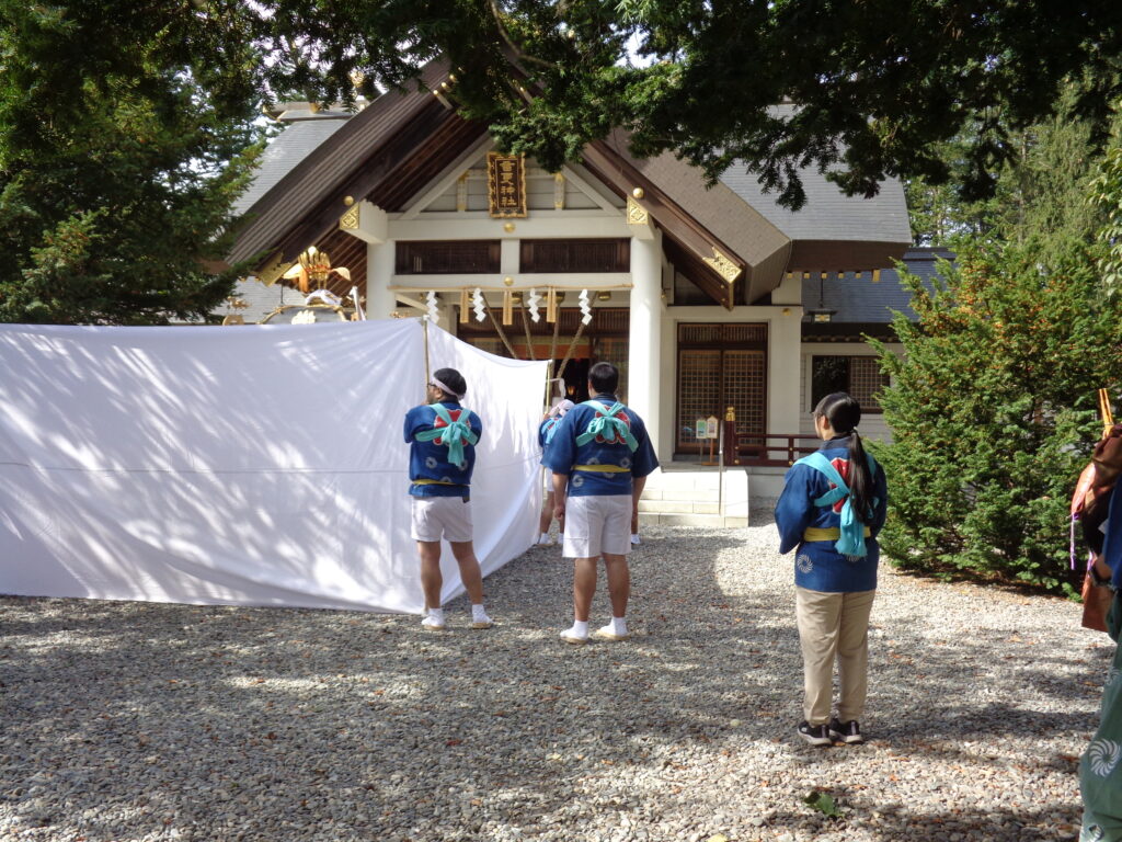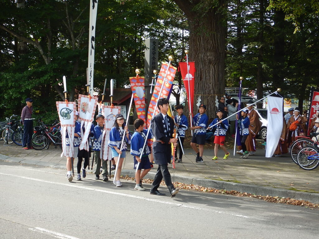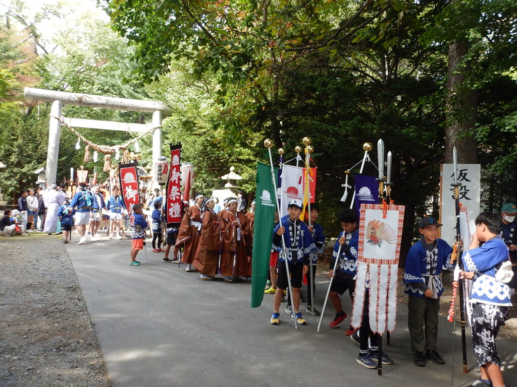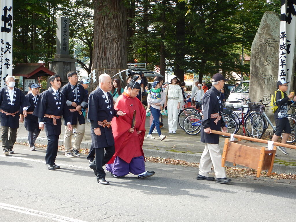 例大祭が厳粛に執り行われ心地よいとかち晴れのなか神輿渡御を行われました 宮司祝詞奏上 音更神社伶人会の皆様の雅楽奏楽 宮司とご参列の皆様方 御神体が御神輿にお遷りなられます 参道を進む御神輿とみこしを担ぐ会の 皆様方 神輿渡御前の奉仕者の皆様 神輿渡御が始まり色取りどりの威儀物を持ち境内を出る子供たち 御神輿が町内を進みます 御神輿の後に宮司、祭典委員長様、 総代様が出発します