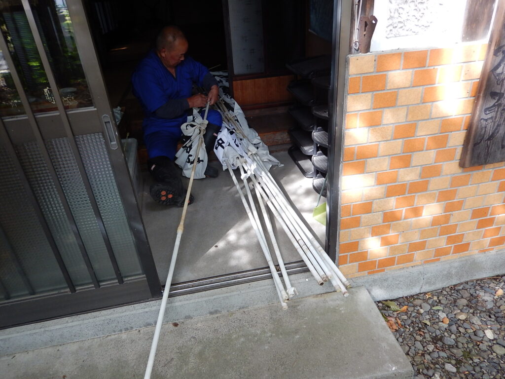 幟降ろしと提灯片付け、神輿渡御で賜りましたお賽銭勘定を役員 総代様により執り行われました お祭りを彩った幟がすべて外されます 境内で使用したテントを片付けました 秋季例大祭のすべての作業が終了した御礼を吉本隆嗣責任役員代表様より賜りました